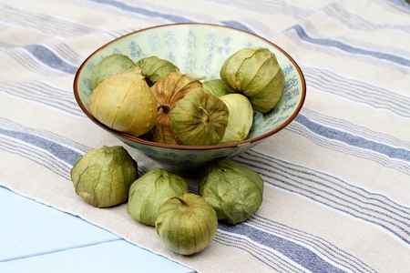 Ceramic bowl of organic green tomatillo on a blue cotton striped cloth