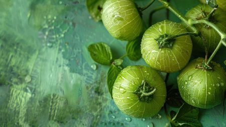 Several green tomatoes, still attached to their vine, are clustered together on a vivid green surface. Water droplets cling to the tomatoes and leaves, reflecting the light and creating a sense of freshness and life.