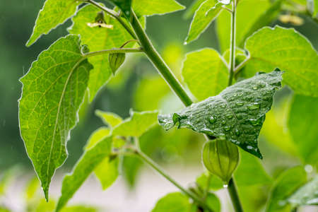 Green veined fruit on a branch of Physalis minima in the garden. Growing pygmy groundcherry (wild cape gooseberry). Solanaceae family