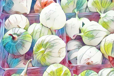 Photo to Art Style filter on a bunch of Tomatillo in cartons, for sale in a farmer's market.