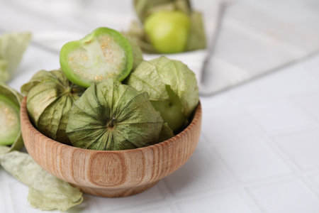 Fresh green tomatillos with husk in bowl on white tiled table, closeup. Space for text
