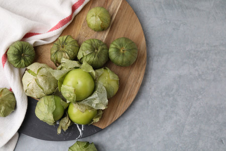 Fresh green tomatillos with husk on gray table, flat lay. Space for text