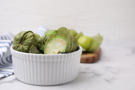 Fresh green tomatillos with husk in bowl on light marble table, closeup