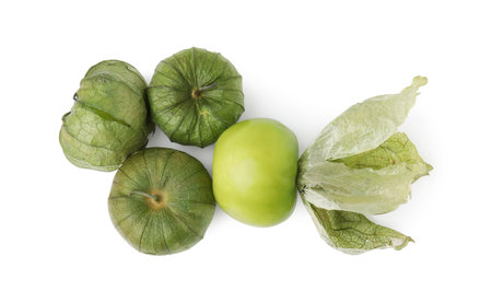 Fresh green tomatillos with husk isolated on white, top view