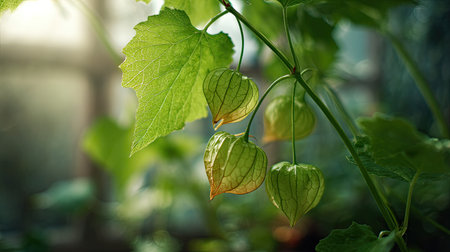 The Groundcherry in spring, fresh green leaves, soft sunlight filtering, vibrant atmosphere full of vitality, natural textures, serene mood.