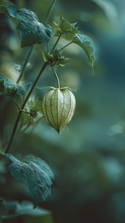 A detailed photograph of a single Groundcherry, swaying gently in the wind, captured in natural daylight. Fresh and airy atmosphere, soft motion blur on leaves, crisp details on textures, background softly blurred into natural greenery, cinematic natural light, realistic photography.