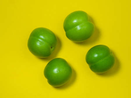 Cherry plum fruits on a yellow background. Healthy green fruit. Southern fruit isolate. Tkemali