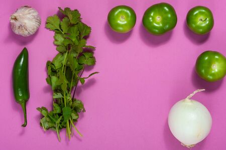 Raw salsa verde ingredients, Mexican food. Tomatillos, onion, garlic, chili peppers and cilantro crushed in a molcajete. Green ingredients on pink background.