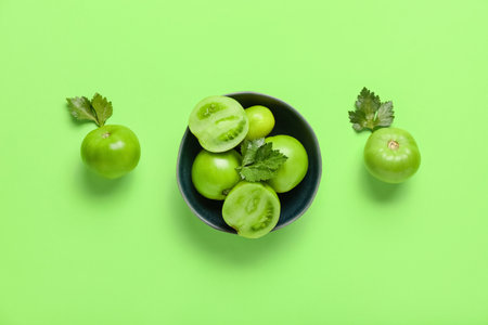 Bowl with fresh green tomatoes on color background