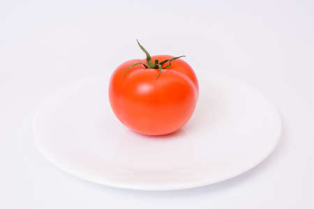 Close up front view photo of fresh with flawless ideal skin raw round tomato on round clear flat crockery isolated on white background copy-space copyspace