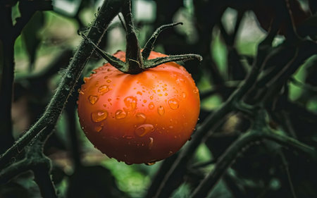 Ripe red tomato on the vine with drops of water after rain
