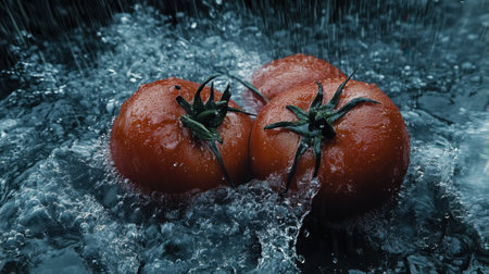 Three tomatoes are sitting on a black surface with water, AI