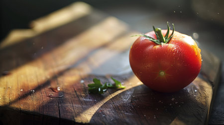 A close-up of a fresh tomato with water droplets, placed on a wooden cutting board with soft sunlight streaming in, highlighting its vibrant red color.