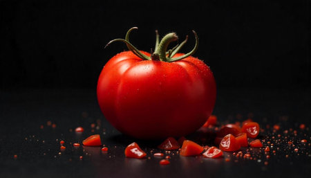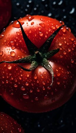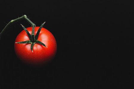 Fresh red tomato on a black background, showcasing vibrant color and healthy eating concept Perfect for food related content and healthy lifestyle imagery