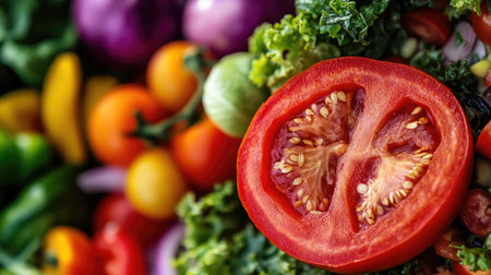 A close-up of a juicy tomato being halved, with seeds and flesh visible, set against a backdrop of a colorful salad and other fresh vegetables.