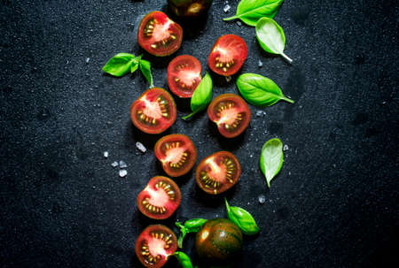 Food background, black and red cherry tomatoes and green basil on a wet stone background, top view