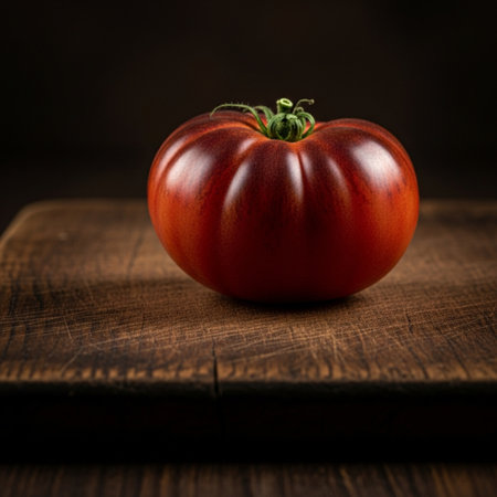 In a dark setting, a glowing red tomato stands out, its glossy surface sparking intrigue against the shadowy backdrop.