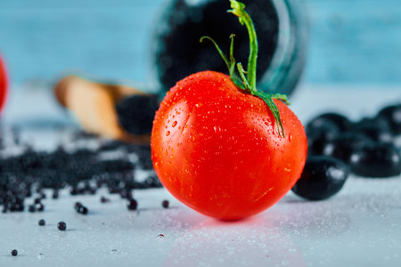 Tomato and black olives on blue background