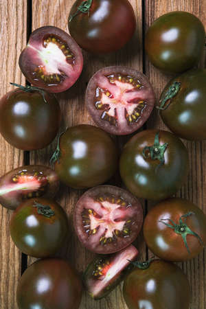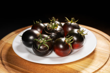 Black tasty juicy kumato tomatoes on black background