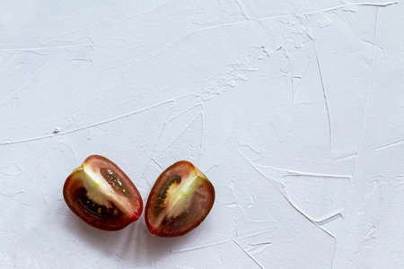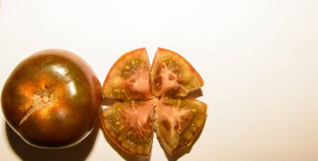Fresh Pair Of Kumato Tomatoes One Of Them Open In Half And Chopped On White Background