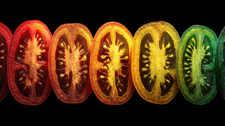 Sliced tomatoes, arranged in a line, exhibit a spectrum of colors from red to green. The image showcases the textures and details of the tomatoes with a focus on interior structure. The lighting creates a contrast against the dark background. This image is suitable for use in culinary projects, health publications, or educational materials.