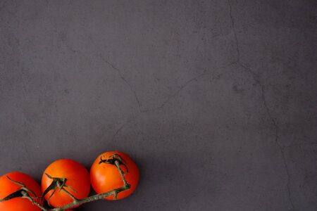 Cherry tomatoes flat lay on black grunge texture abstract background. Food, vegetables photography. Top view, horizontal, neutral vintage moody image style.