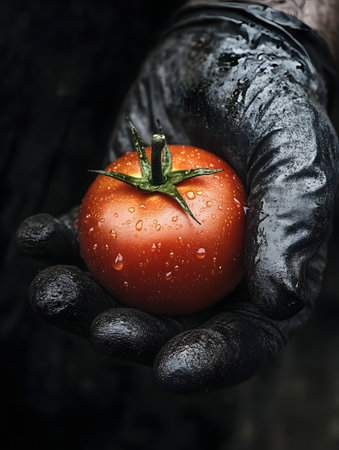 Closeup of a farmer's hand holding a single, ripe red tomato with droplets of morning dew, showcasing the detail and simplicity of fresh, organic produce from the garden or farm.