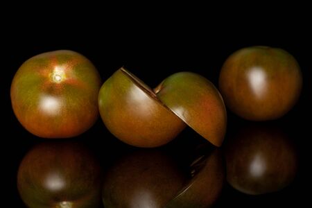 Group of two whole two halves of fresh green red tomato isolated on black glass