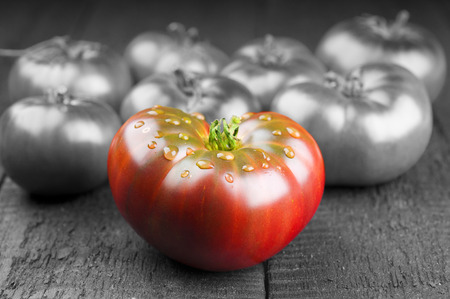 Bright, red and ripe tomato on dark grey background.