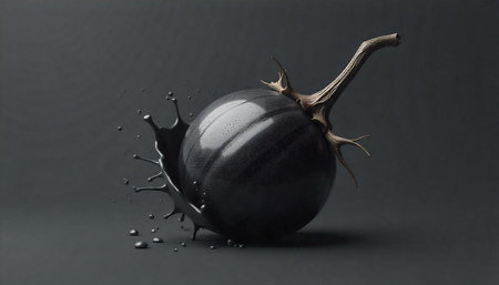 Dark gourd sphere with liquid splash against a gray backdrop