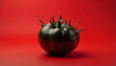 Dark tomato on red surface with dynamic liquid splashes