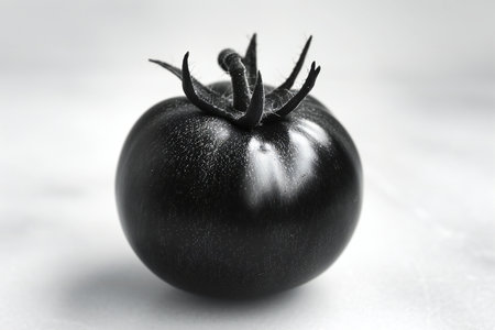 Black tomato on a white background. Shallow depth of field.