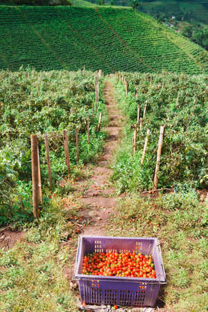 Process of harvesting tomatoes. Harvesting organic tomatoes in greenhouse. Many different tomato in summer day.