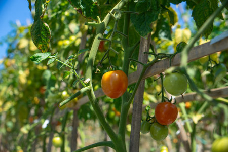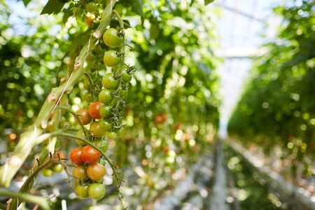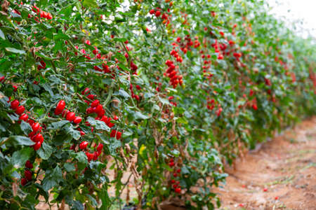 Beautiful view of red cherry tomatoes in a greenhouse in the countryside. Soft morning lighting without harsh shadows.