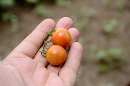 closeup red ripe tomato hold hand over out of focus green brown background.