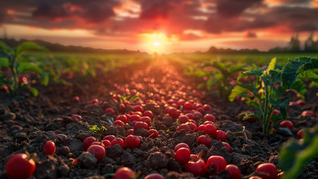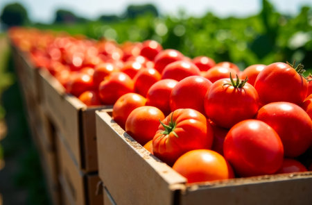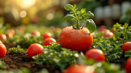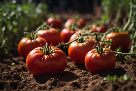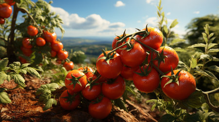 A beautiful scene of fresh tomatoes growing on vines in a lush green field. The vibrant colors and surrounding landscape highlight the essence of agriculture and healthy farming.