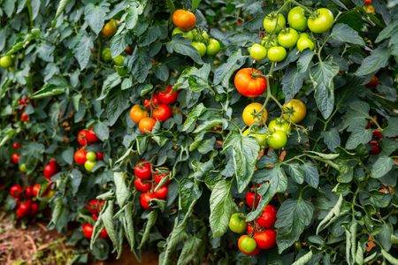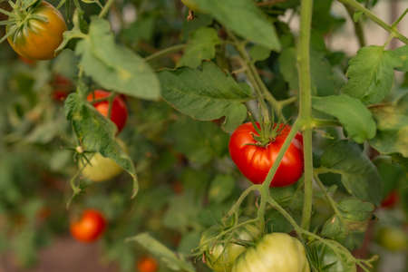 Natural tomato greenhouse. Beautiful red ripe and green tomatoes grown in a greenhouse