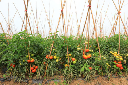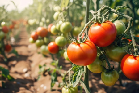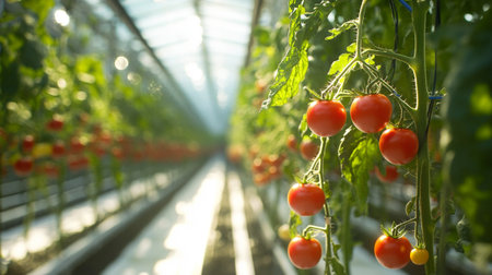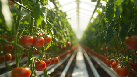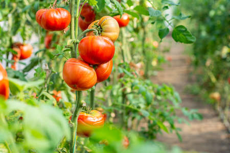 Beautiful view of red tomatoes in a greenhouse in the countryside. Soft morning lighting without harsh shadows.