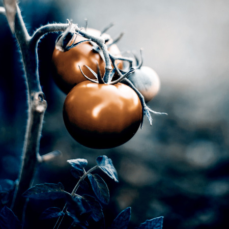Tiny red and green tomatoes on bush. End of gardening season. Healthy oranic vegetarian food.