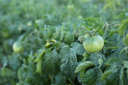 Beautiful green tomato plants growing in the field, closeup. Space for text