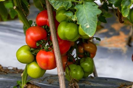 Ripe organic tomatoes in garden ready to harvest, Fresh tomatoes