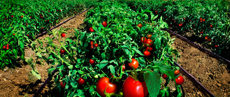 Growing of red salad or sauce tomatoes in greenhouses in Lazio, agriculture in Italy