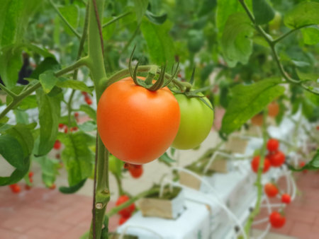 Closeup view on plantation of beautiful, delicious green and red ripe tomatoes grown in polycarbonate greenhouse on blurred background. Tomato hanging on the vine of plant. Horticulture. Vegetables