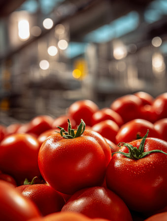Juicy, sun-ripened tomatoes with vivid red hue and fresh green stems are showcased in a lively market scene, illuminated by warm light against a softly blurred backd