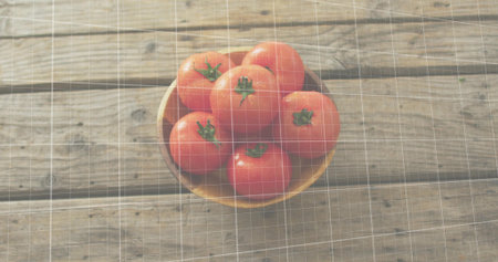 Sitting round shallow yellow bowl containing six ripe red tomatoes on wooden tabletop, grid overlay. Overhead, tomato, ceramicware, planks, kitchen, rustic, texture