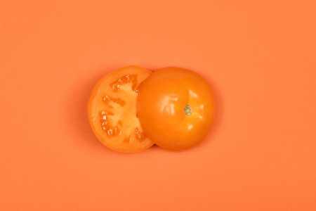 tomato on a orange background, close-up, horizontal photo
