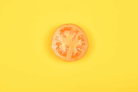 Tomato slice isolated on yellow background, top view