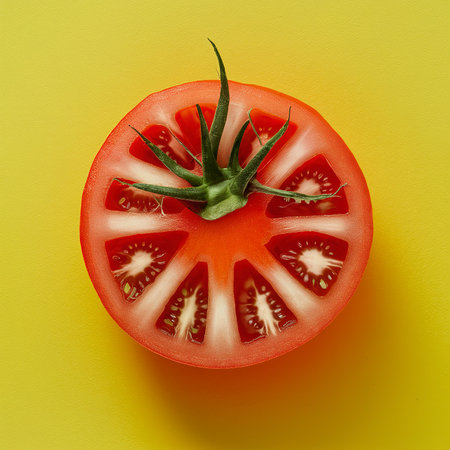 Juicy Red Tomato Slice, Vibrant Color Contrast, Isolated on Yellow, Healthy Eating Concept