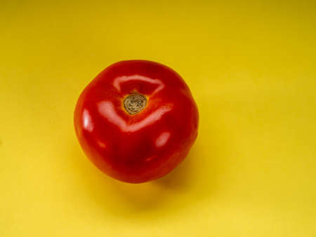 Bright red tomato on a yellow background close-up copy space