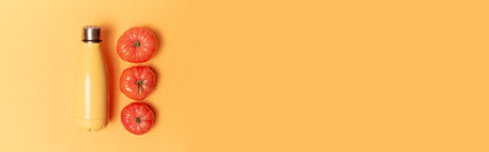 Steel thermo water bottle and three pink tomatoes on yellow panoramic background with copy space.